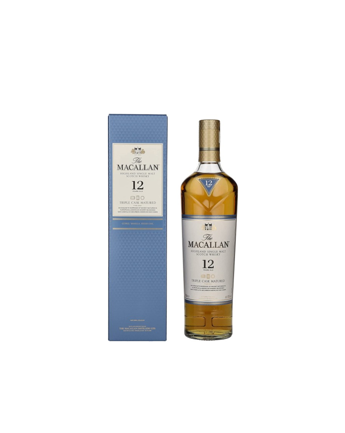 The Macallan 12 Years Triple Cask is a single malt Scotch whisky that stands out for its refined quality and unique maturation process. Aged for 12 years in a combination of European and American oak casks, previously used for sherry and bourbon, this whiskey is characterized by its balance and complexity. The Macallan Triple Cask expression is recognized for its smoothness and versatility, making it an ideal choice for both the initiated in the world of whiskey and for the most demanding palates. An emblematic piece that represents the legacy of Macallan.